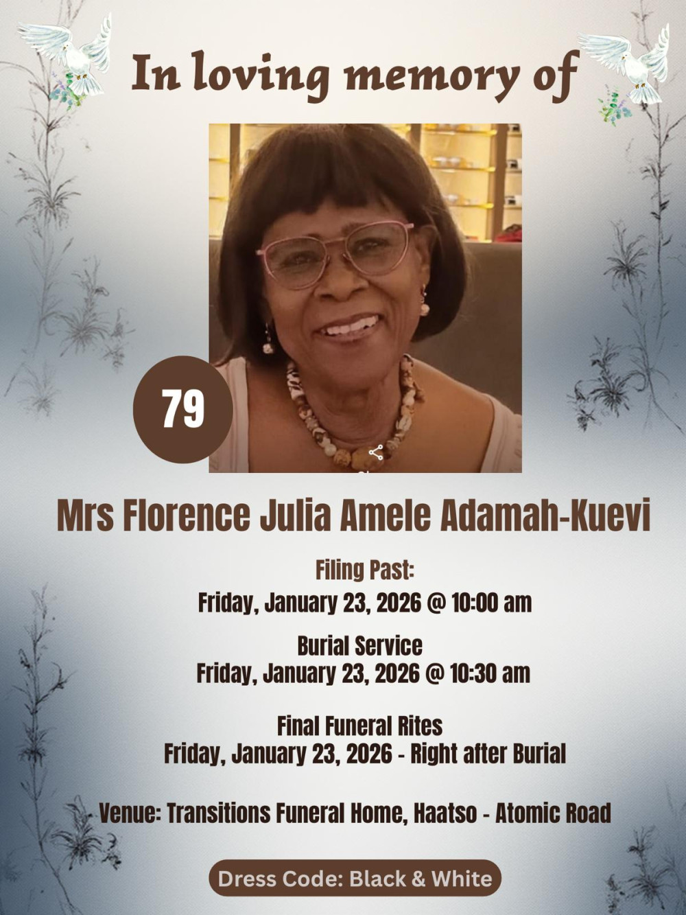 Private Burial Service at Transitions Place. Asore Junction, Haatso Accra Date: 23rd January, 2026 Time: 10:30 am Interment: Private