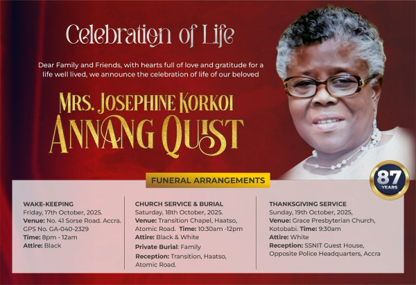 Private Burial Service at Transitions Place. Asore Junction, Haatso Accra Date: 18th October, 2025 Time: 10:30 am Interment: Private