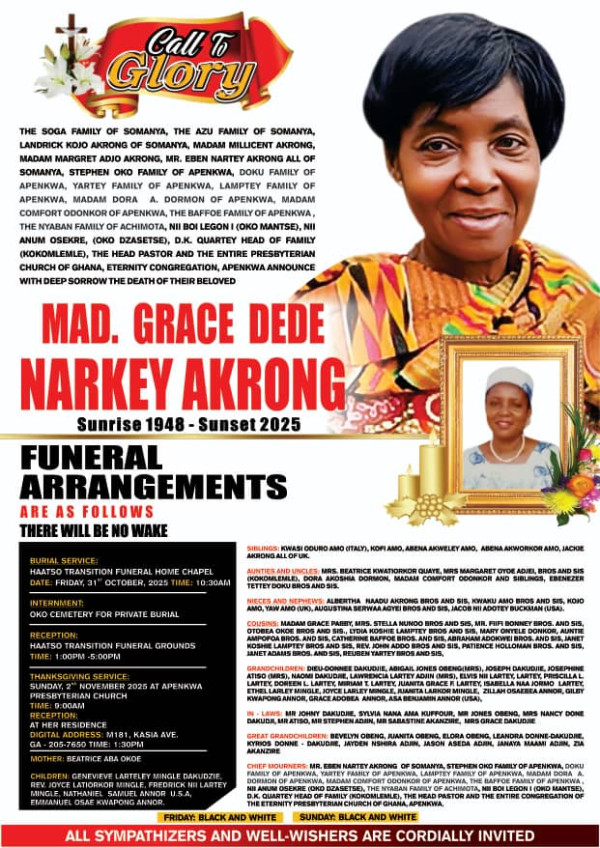 Funeral @ Transitions Place, Haatso Time: 08:00am Interment: Private