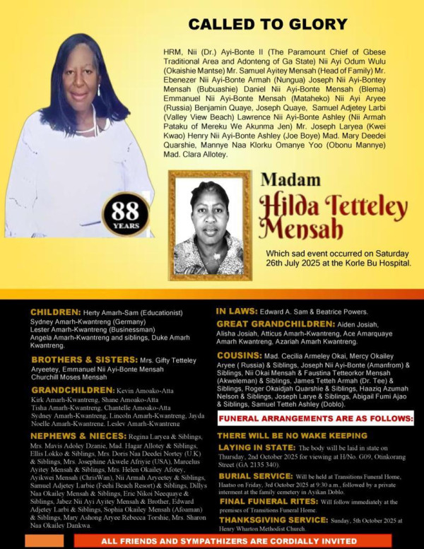 Burial Service at Transitions Place. Asore Junction, Haatso Accra Date: 3rd October ,2025 Time: 10 :30am Interment: Private