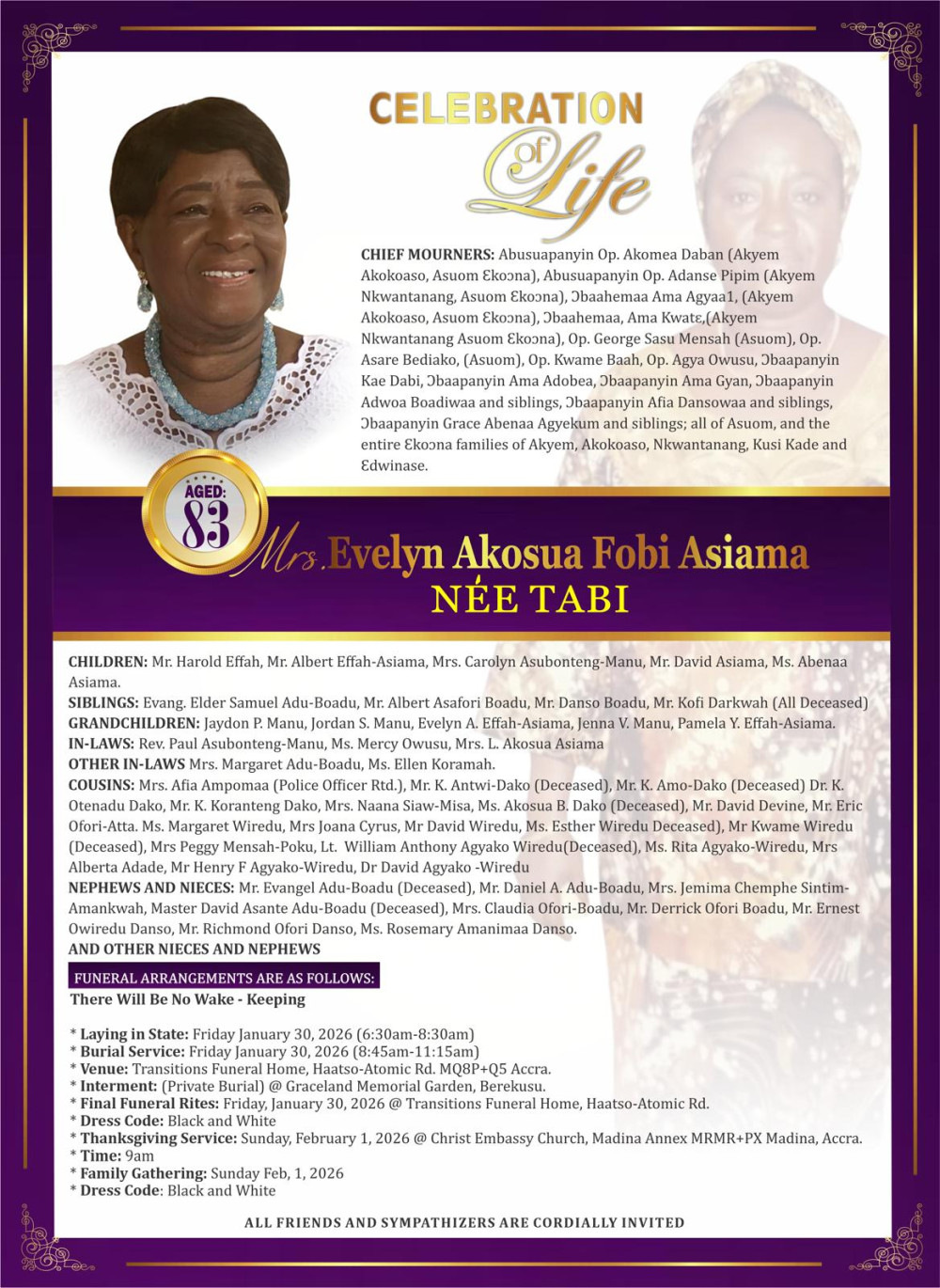Private Burial Service at Transitions Place. Asore Junction, Haatso Accra Date: 30th January, 2026 Time: 06:30am Interment: Private